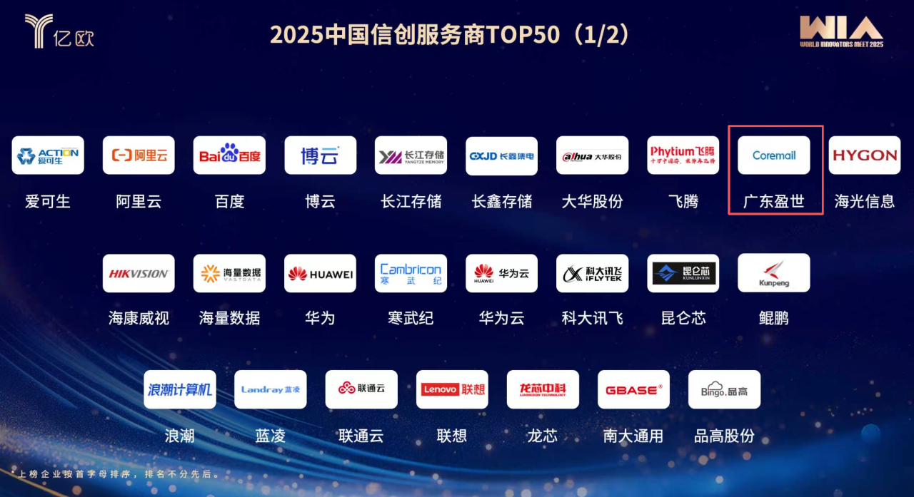 近日,亿欧智库《2025年信创产业发展趋势及 50 强报告》重磅发布,Coremail凭借深耕行业的技术实力和信创落地的丰富经验再次登榜50强!