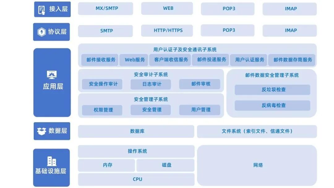 Coremail邮件系统历时26年,把不同的功能模块化,最大程度地减少系统的数据冗余,增强系统的稳定性和运作性。系统采用分布式部署架构,最大地避免系统宕机,同时系统可保持高拓展性。
