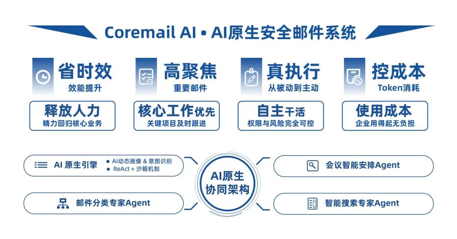 在此背景下,Coremail基于27年邮件行业的积淀,将新技术和邮件系统有机结合,打造Coremail AI原生安全邮件系统,直击企业邮件处理海量信息淹没、人工整理耗时传统 AI 低效高成本等核心痛点。该系统采用AI原生协同架构,基于AI原生引擎,协同邮件分类专家Agent、会议智能安排Agent、智能搜索专家Agent,实现AI动态画像和意图识别,在权限与风险可控的前提下做到AI自主干活,提升效能。该系统将在近期重磅发布,敬请期待!