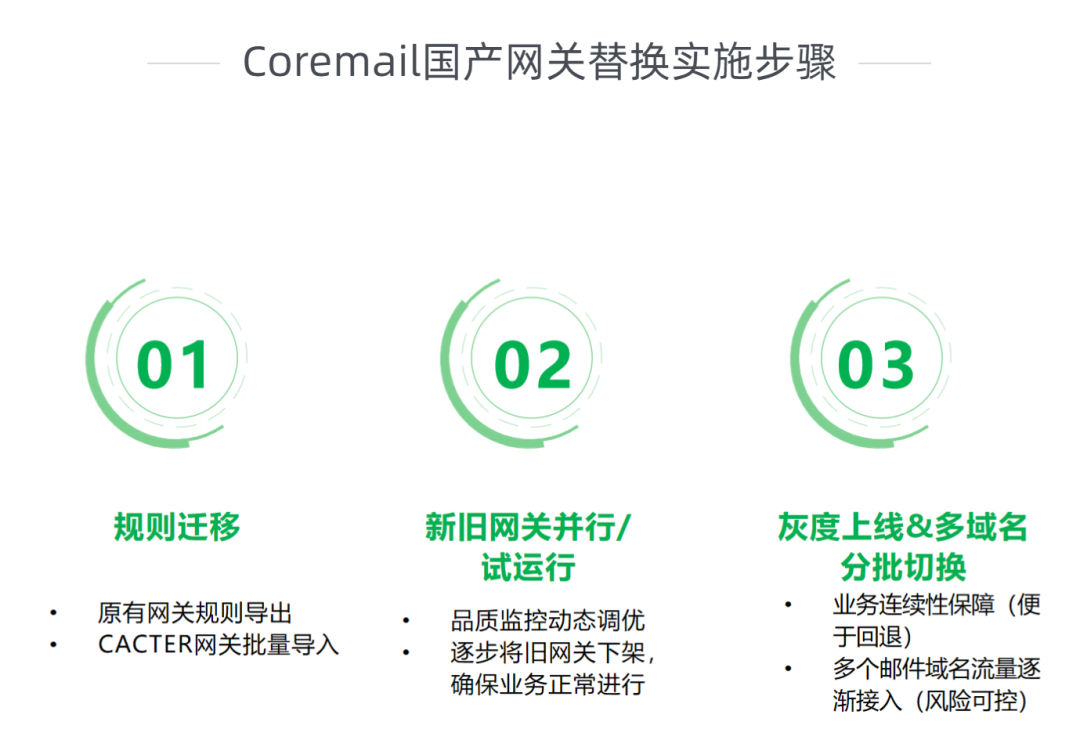 Coremail可结合该客户具体情况量身定制CACTER网关替换上线方案。
